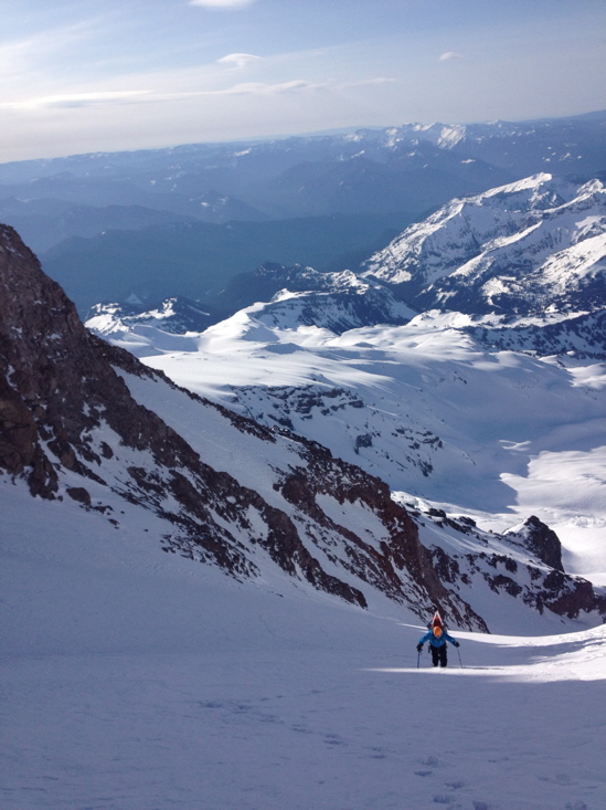 We left camp around 3:30am and made our way across the upper Wilson easily on foot, opting to ditch skins from the onset in the interest of saving weight and transition time. As we entered the finger the snow conditions deteriorated from supportable crust to the same breakable crust with about 16 inches of sugar underneath. It made for an absolutely exhausting and painfully slow bootpack up the finger. After 6 hours of uphill snow swimming we reached the edge of the upper Nisqually Glacier at about 12,300ft, and given our energy level, snow conditions, time, and the quickly growing lenticular, we put our skis back on and enjoyed an alternately icy, windblown, and breakable crust skiing back to camp. Luckily, the ski down to the bridge more than made up for the conditions up top: killer spring skiing on nice consolidated snow. We came home to bacon wrapped steaks prepared by our very own Tater, thanks buddy!