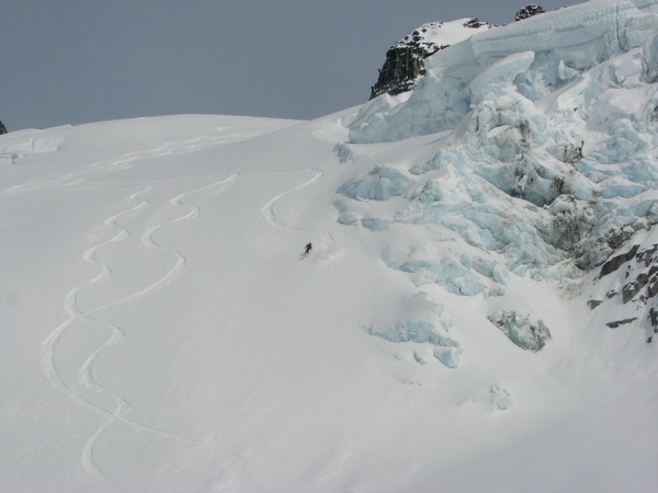 Once down on calmer terrain, we stopped a few times before skiing between an icefall to a bench below the 7800-ft pass. Each of us had smiles and grins - shortness of breath - with our minds no longer muddied by anything so complicated as Why?