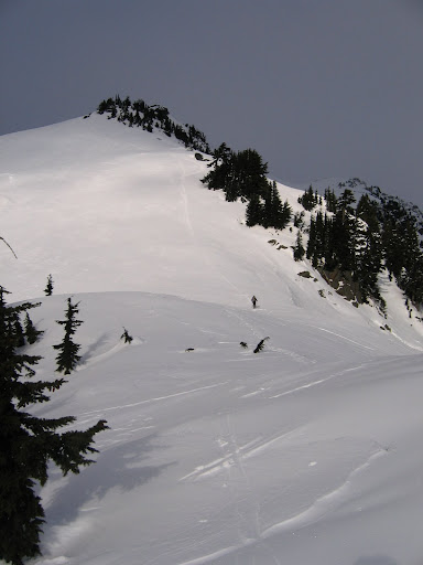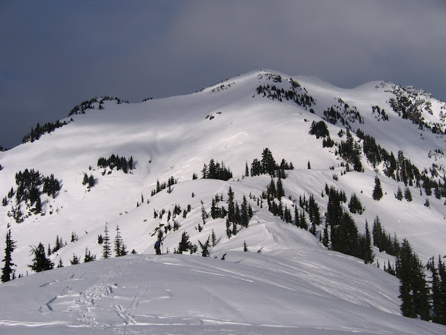 We went to the end of the summer trail then cramponed up a steeper section to what appears to be Point 6045 on the Green Trails map. Making provision to keep enough daylight on the 18th shortest day of the year, we headed down from there. Icy crust near the top, nice turns for about 1000' in the middle, then all out survival skiing in the woods.