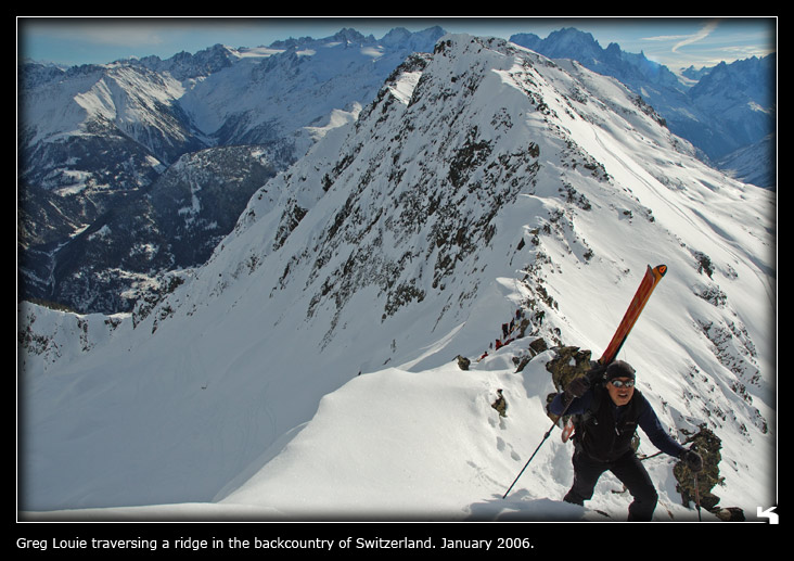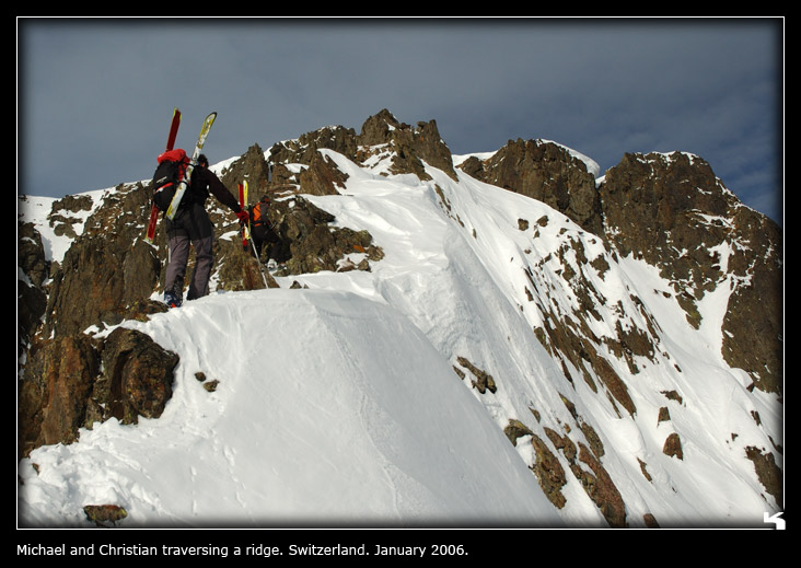 after snacking, Christian decided for us to climb up a ridge (with skis on our packs) from the pass to gain a summit for better views and a descent in fresh snow. so climb we did, but the ridge was a bit exposed in some spots. a few sections felt somewhat uncomfortable, but i managed with some encouragement. here's a picture of Michael and Christian on the ridge. here's one looking back at Greg.