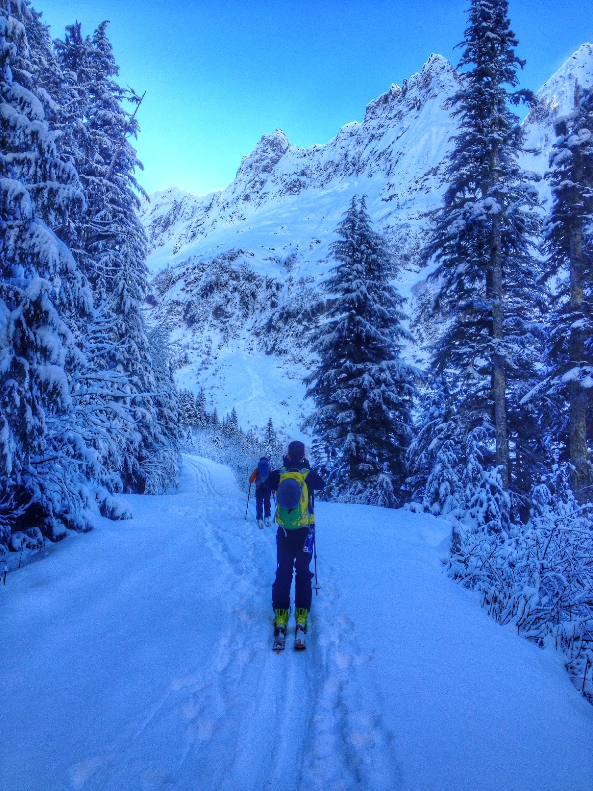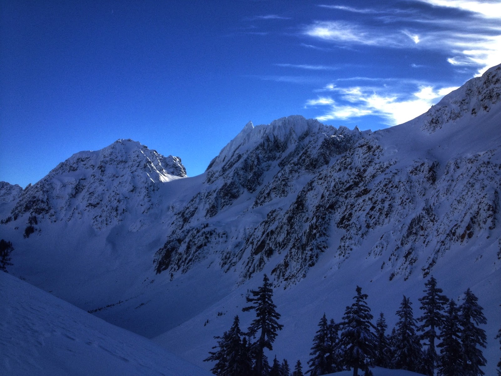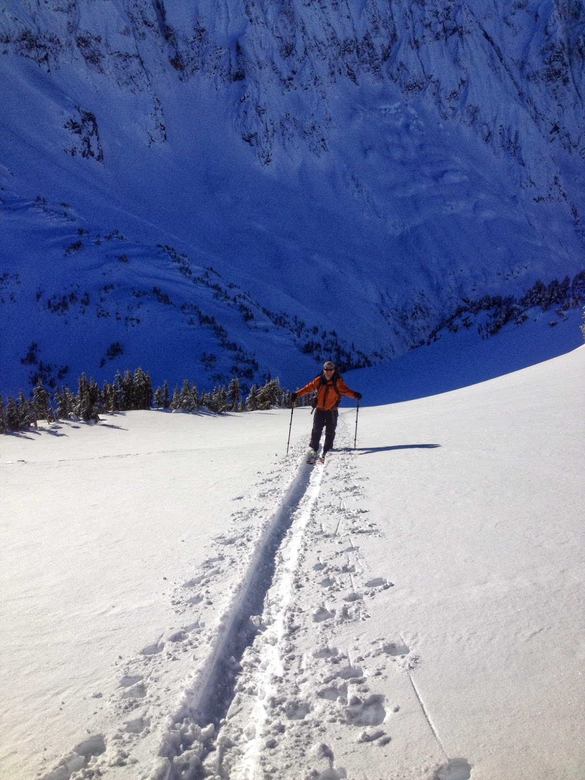 We followed another groups skin track up to Cascade Pass. Wind had come through the valley and scoured much of the new snow on west faces, east could prove great.