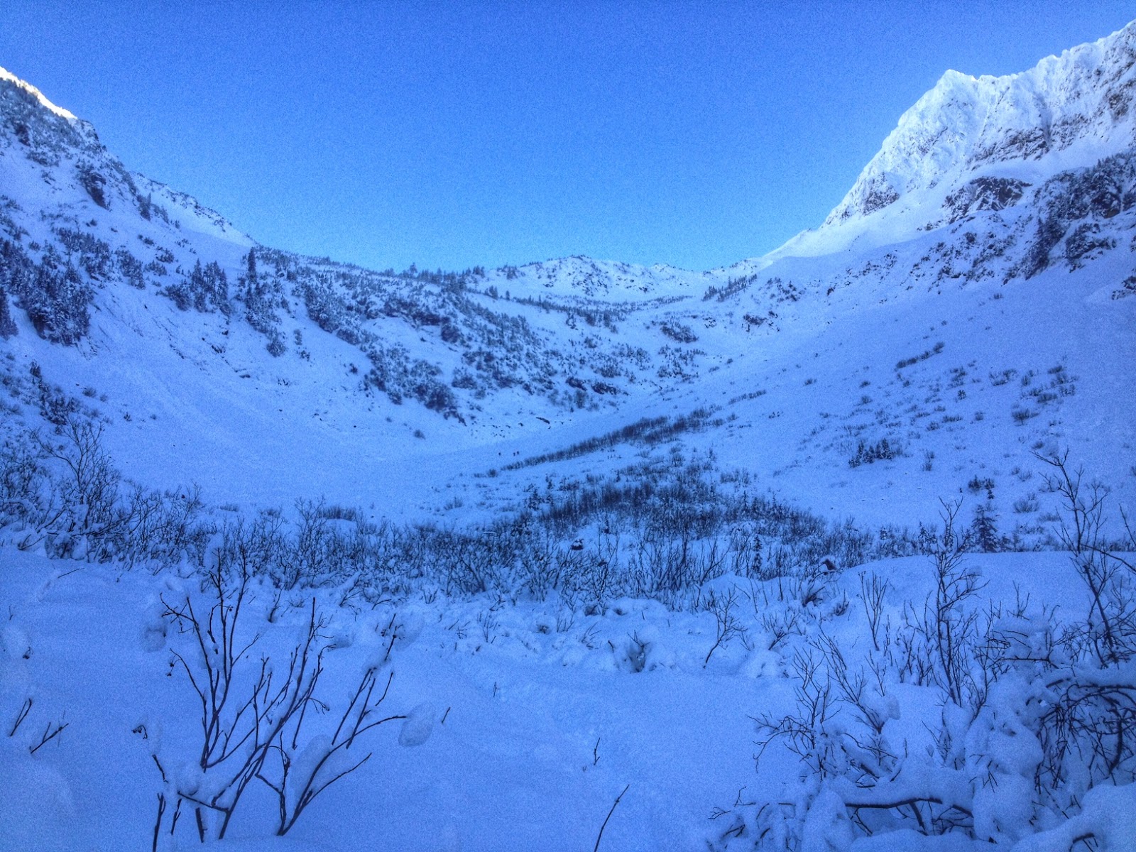 We decided to not continue up the arm and drop back in to Pelton Basin having found stable dry powder. I was too excited about getting powder turns to bother taking any pictures here, I'll just say it was great, take my word for it. We debated doing a quick jaunt up toward mix up and then dropping in to Pelton Basin again, but my legs were tired, food sounded good, and I had a little concern of the stability since that aspect sees different wind loading. We went back to the parking lot and found surprisingly good snow all the way to the alder field of cursing.
