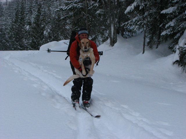 We left in a pretty good skin track and lots of untracked terrain. Cali was a bit wiped from all of the laps and her incessant postholing and needed a bit of a lift on the way down.