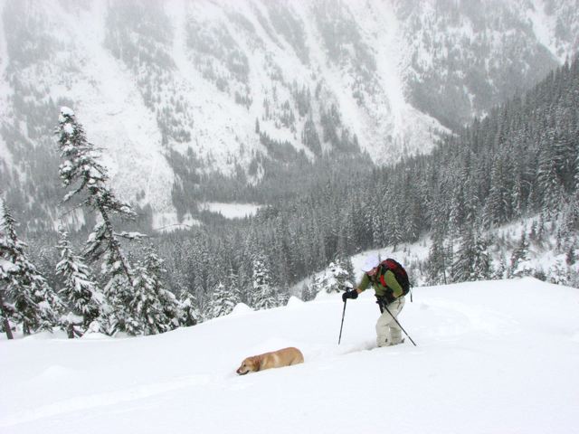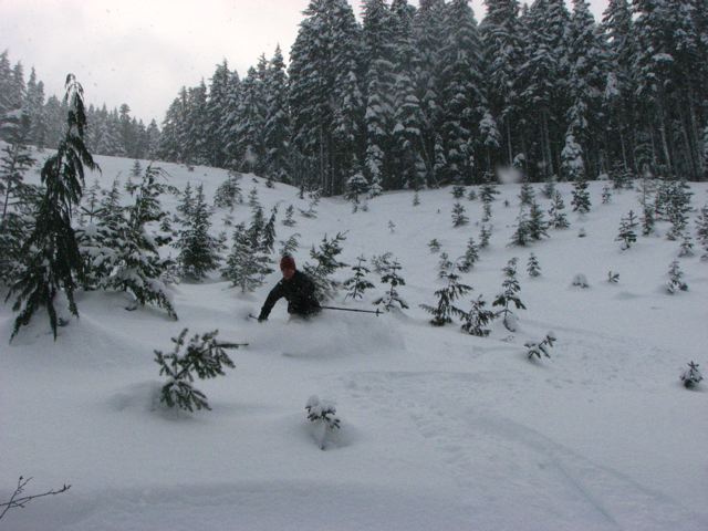 The parking area 100 m west of the Snowplow shed is open and well-plowed. We left from there and headed up up the forest service road leading up to Arrowhead Peak. We broke trail up the road for a while until arriving at a nice glade in the basin well below the summit. We ended up taking 3 laps up and down the glade on various aspects (each > 500 ft of vertical), finding nice soft snow and lots of good turns. No stability issues as there were plenty of small, but well spaced trees to make for good turns but little in the way of buried snags to grab your skis. We didn't encounter any of the bad snow described in a report from the Snoqualmie Pass from the day before and saw no one else the entire day. There was probably about a foot of powder on top of a firmer layer but no buried crust.