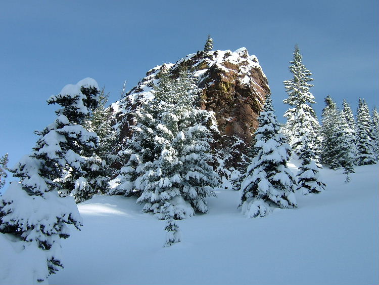 We left your ski track before the rock in the steep trees but continued along the same general path up to the rock. It looked like maybe our skis were biting into the crust under the fluff a little better than the splits on the steep stuff. We followed the traverse under the pictured rock but when the track went down and North into the drainage we veered up and East to the ridge. I think next time I head up there I will use the same clearing to start and immediately head hard left (North) at the top of the clearing into the drainage and follow the drainage to the saddle.