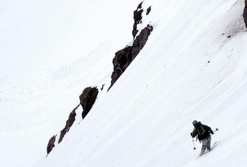 The crunchy snow on top turned to 6 inches of powder-like smoothness as we took our first turns down the east ridge. Although the east ridge itself is rounded and moderate, its not very wide and the steep drops on both sides provides a nice airy feel. When we arrived at the couloir we discovered it was not to steep (40-45 degrees at the top) and perfectly corned up. The skiing was sublime on smooth perfection. We soared down the Cool Glacier and back to the entrance to the Gerdine where we stopped for lunch and gazed back at the bounty we had harvested on the most isolated of Cascade volcanoes. We had worked hard to reach this point and we were rewarded with the perfect line on the perfect day.