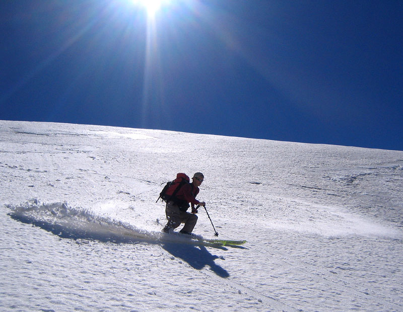 A handful of crevasses are starting to open up on the Russell (maybe 10 or so) but are fairly narrow and easy to end run. We skinned and booted to the highest point over the Russell (my altimeter said 10,013 ft) - it's the little point between the south end of the Russell and the Liberty Cap Glacier - and skied from slightly below that.
