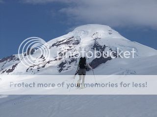 We skinned to the summit (with ski crampons) in 5 1/2 hours. We weren't trying to go fast but I think we each were a bit nervous about skiing the Park at sundown. By the time we ripped our skins the wind had picked up and a light cloud had enveloped us. I'd been hoping for a few inches of fresh after the previous day's snowfall, but conditions were flat out firm. We skied the ridge climbers left of the Park Headwall and dropped into the Park when our sphincters relaxed enough to allow us to do so.http://i1082.photobucket.com/albums/j372/ryan_lurie/Monika%20Traverse%20July%202%20%20%20%20%202011/DSCF6085.jpg" />