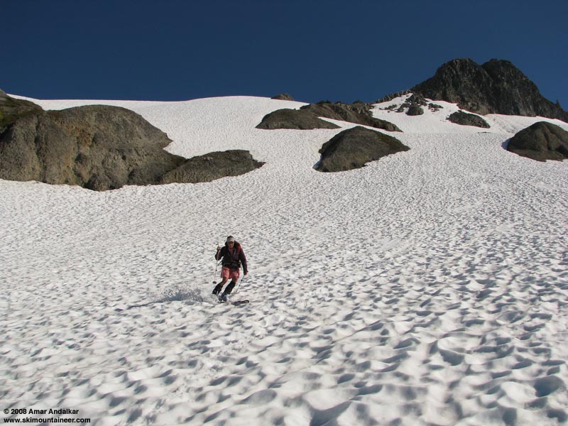 It's definitely a very beautiful area, but every time I go out there I'm reminded just how much lengthy traversing (up, down, horizontal, skins, no skins, etc.) is needed in order to get there and back. It's much longer and farther in practice than it appears to be on the map or by the numbers. A nice tour for soaking in the sun and scenery or yo-yoing short runs off to the sides of the traverse route, but not the place for big-time turns unless you can make it most of the way up the Park Glacier, say 9000+ ft. We were hoping to make it past Glacier Saddle up onto the Park, but it was getting too late. We carried a rope and glacier gear, but never used it.