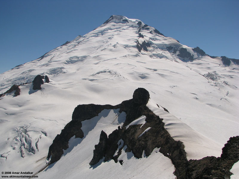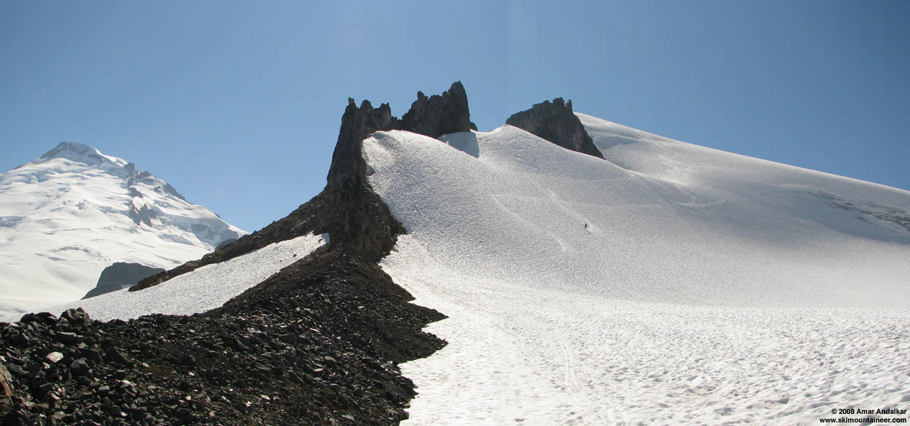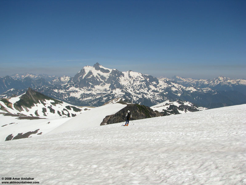 Victor skiing the upper Sholes Glacier, with Coleman Pinnacle below at left and Mt Shuksan in the distance.