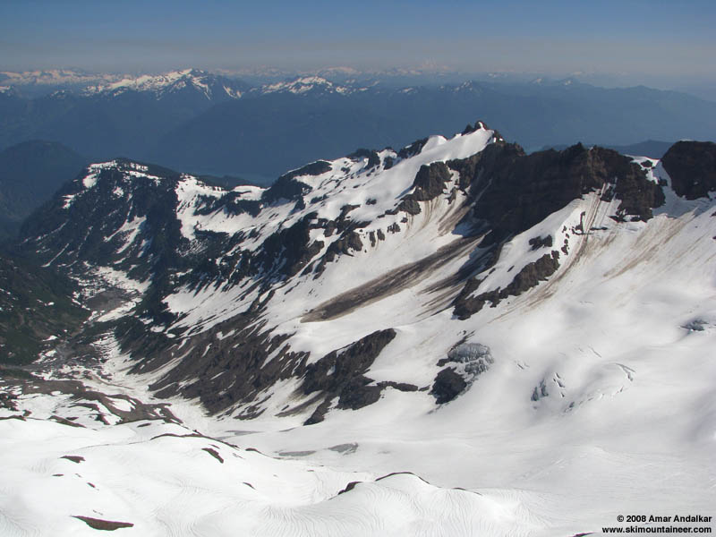 From its 6940 ft summit, the Sholes Glacier offers about 1500 vertical ft right now down into Sholes Creek drainage, with only a few open crevasses on the steep roll. The Rainbow Glacier also looked good, probably skiable down to about 5000 ft with few crevasses and several areas of bare glacier ice showing. The Park Glacier looks fairly crevassed, worse than typical for late July.
