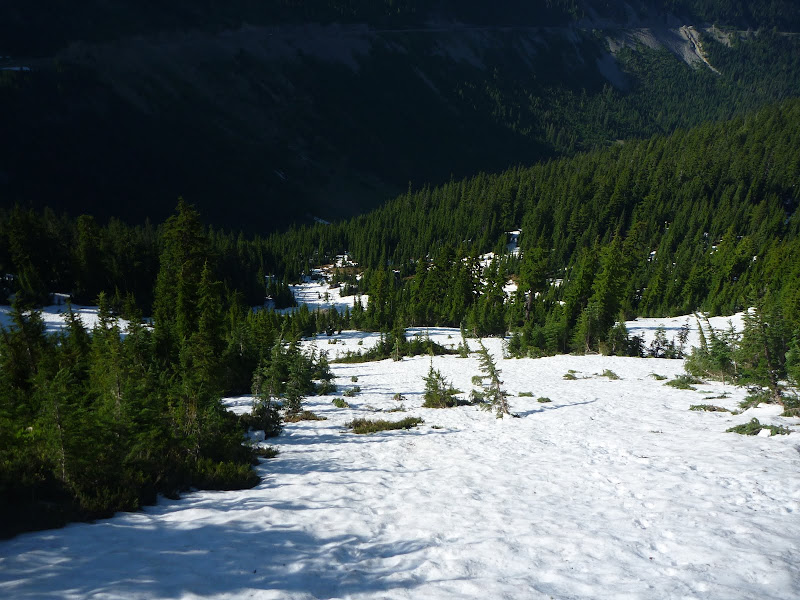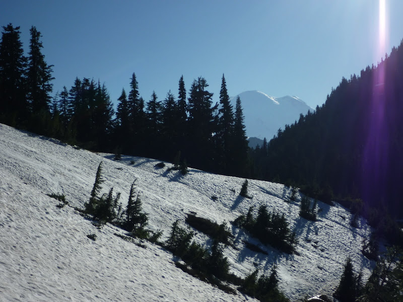 I had hoped I'd have enough legs to go grab a run at Chinook after biking. So I left the truck at the pass about 5pm and started booting. Did a couple 400' laps and booted back up, before the final 200' down to the pass. The snow was surprisingly firm and the trees were patchy at best. The second run I went a little farther south and really had to fight through the trees to link the main snowfields, but that's the fun part anyway ;)