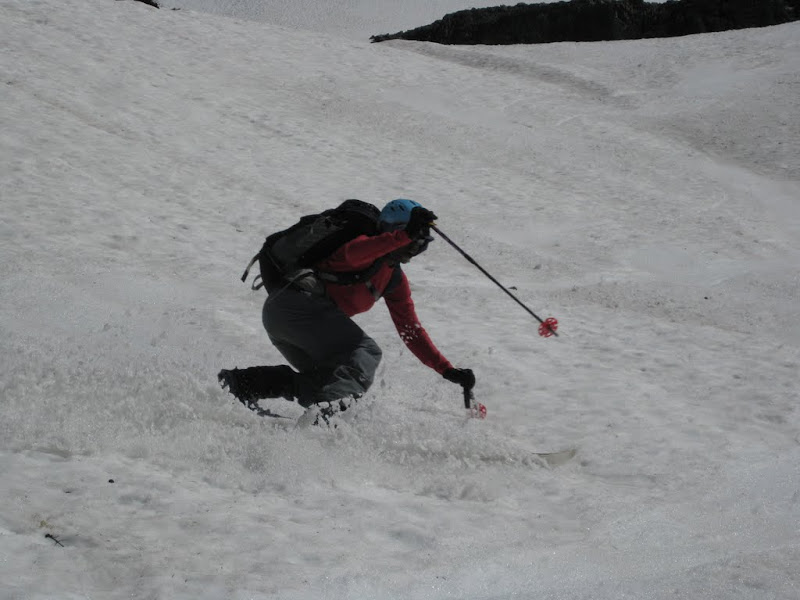 Brenda and I dragged our friend Frank up to Mt Baker area for a great day out at the Coleman Pinnacle. There is so much snow. Granted we've only been visiting the area for the last 5 season or so, I've never seen it like this so late in the year. Skis on pretty much from the car, then across the basin and up to Hermans Saddle. There's a nice run down to Iceberg Lake that we like to ski, then a short uphill traverse to ski a short mellow gully down to Wells Crk before the long slog up to the first high pt along Ptarmagin Ridge. Again, so much snow. We made it to the ridge on the far side of the Pinnacle at around 3:30. Man it was warm out there, but the snow was decent. A bit suncupped, but soft enough to not be a problem, and never sticky. The 3 of us were on Karhu Guides, and the return trip to the east end of Table Mtn was completed with a single boot up - Frank managed it with a short uncomfortable traverse, no problem. I consider this tour ideal for these skis. A continuous snow finger remains at the end of Table Mtn, making for an easy boot up to the trail. Mostly skiing with a bit of road walking from Artist Pt had us at the car just after 6:00. I think there's a single blueberry chute that's still continuous that would have saved some time, but we passed. Anyway, there's so much snow.