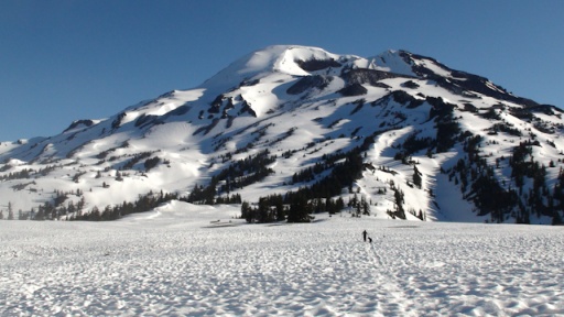 Doug, Glad to see your TR and photos. The first photo provides a nice perspective of the sun cups on the flats and the mountain. Nice smooth turns on the third photo.
