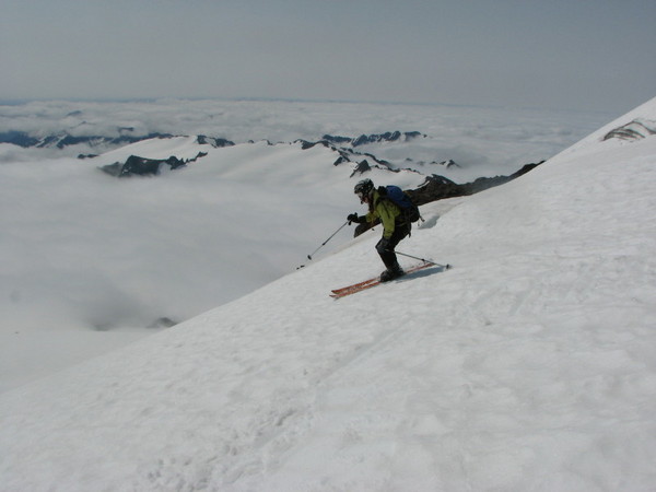 Had concerns about snow stability with all that rain but lucky for us Saturday night the rains stopped, the temps. cooled and the winds blew. Turned out this made for super stable ski conditions Sunday with the perfect amount of softness. Left Sunday to lose what little vis we had to traverse and climb up to ~ 7800 on the Honeycomb gl. and then descend on the Suiattle gl. down to ~ 7100, traverse down low and find ourselves climbing up again. I wished my navigation skills were better in all that marine layer, used a LOT more time because of this. And it didn't burn off. Arriving Friday there were already clouds rolling in, so we never had a chance to see the approach over to Glacier pk. Well we did break out of it and got onto the Cool glacier and reached the col between Disappointment pk and the summit making the top from the SW side at 10am.