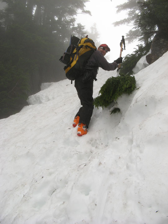 The rest of the chute was the best snow on the trip - not as slushy as higher up and a long, sustained pitch with good visibility thanks to the contrast with the trees and cliffs (it was still kinda foggy). Once down in the valley, we were able ski easily to about 3000' elevation making for a 3600' descent for the day. We then "survival skied" for another couple miles and 500' more vertical but it was not that fun - the snow was full of tree gunk and we were soaked going through thickets of small trees. We walked down the last couple miles.