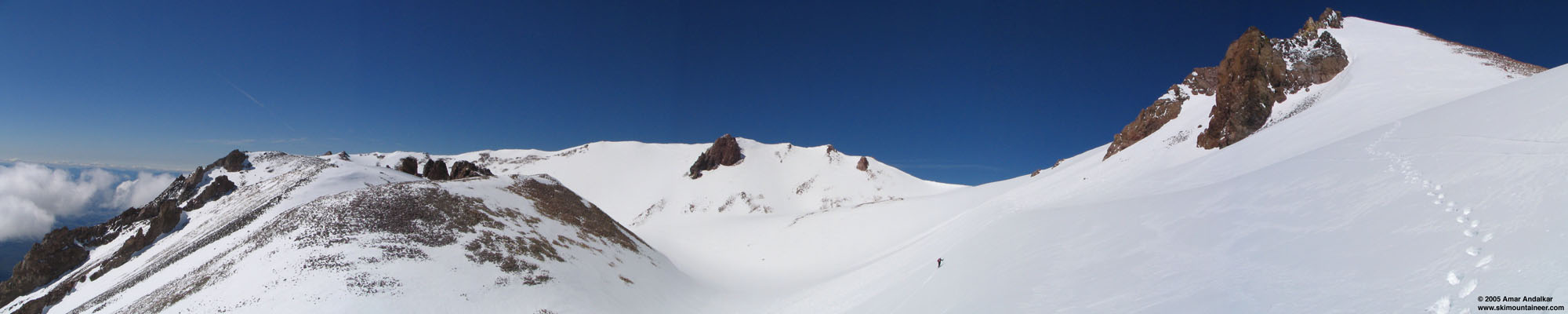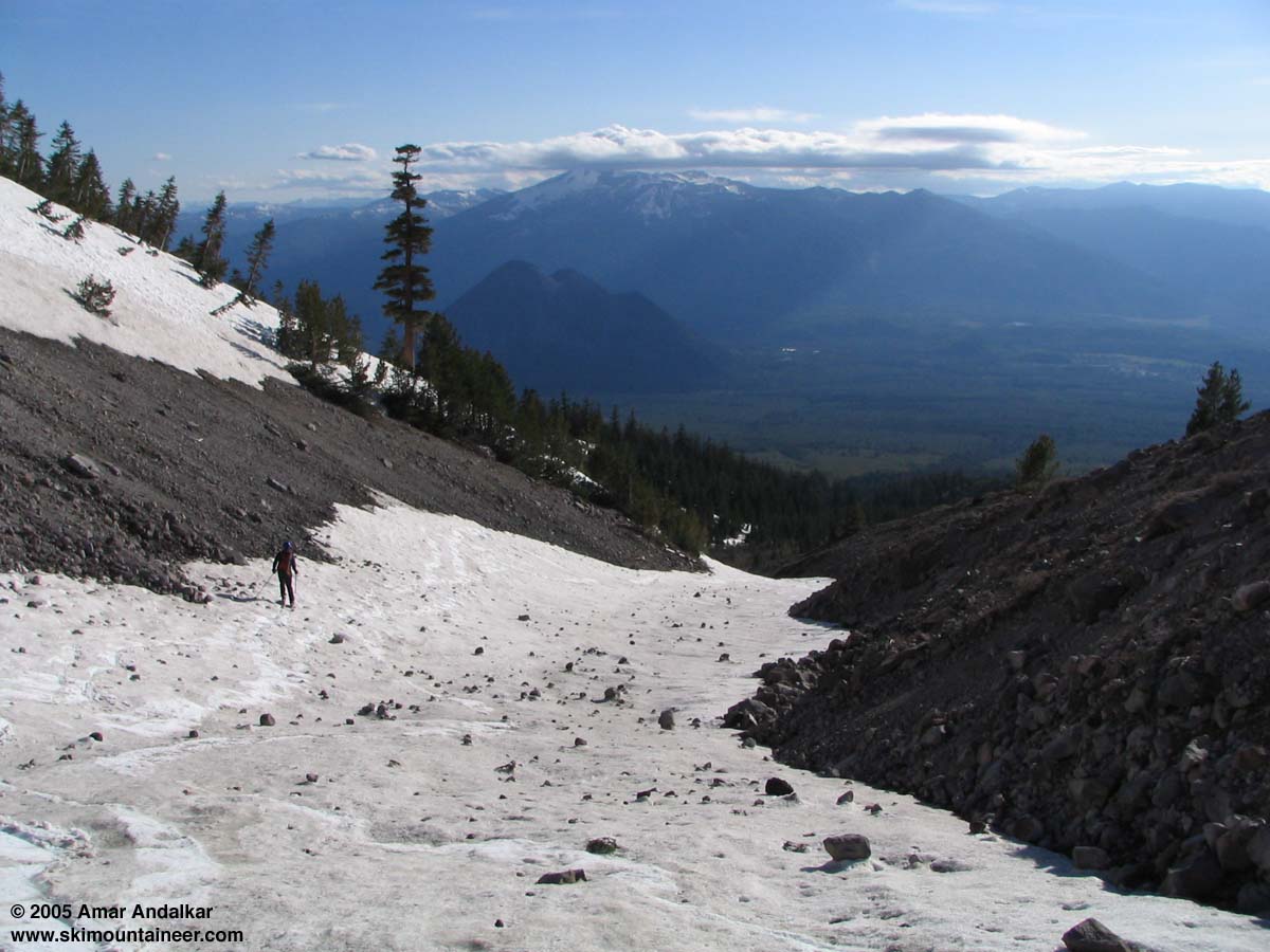 The upper part of the canyon above 10500 ft steepens to perhaps 35 degrees, and I was forced to put the skis on my pack and crampon up. Jeff, however, continued to skin, . The snow conditions in the upper canyon were 4-6" of partly-consolidated recent snow over a firm base, ideal for both skinning and climbing at this late hour. It was almost 4 PM by the time I reached the floor of the crater at nearly 11800 ft, with Jeff perhaps 20 minutes ahead of me. I followed the snowboarders' boot pack to the summit, while Jeff continued skinning all the way to 12200 ft, just below the summit pinnacle (view a 5-image panorama of Shastina's crater and summit, at 2 resolutions: 2000 or 4000 pixels wide). At this point, the snow was frozen solid and the pleasant breeze in the canyon had becoming a roaring 30 mph wind, with stronger gusts to 40+ mph. We both cramponed up the . Below that the slope turned to very fine corn, all the way to about 8000 ft. Below that, the skiing became More challenging through the rocky minefield of the gully. After exiting the gully, we skied the sticky glop in the woods all the way down to 7200 ft, and hiked back to the car just after 7 PM. It was a fantastic day, with good to excellent snow conditions and beautiful weather (other than the summit winds), 5100 vertical ft of skiing down a magnificently direct route. Diller Canyon is a great ski, but anyone who says that it's a good route in mid-summer is full of it. Despite the deepest June snowpack on Shasta in many years, we just barely caught the route in time for a full top-to-bottom ski. The part below 8000 ft will soon rapidly melt out, and increasing rockfall will make the floor of the upper canyon very hazardous. I think Diller Canyon is a great spring ski route, and probably best done when the nasty last miles of road above 6000 ft are still snow-covered.