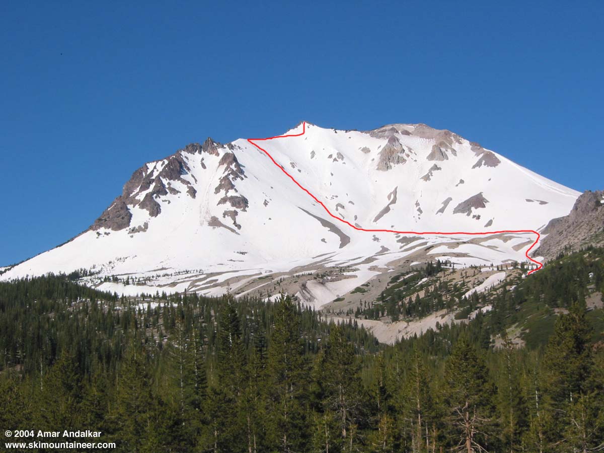 This photo shows the NE face of Lassen Peak from the Devastated Area, with my ski descent route shown in red. The summit trail is on the opposite side of the mountain. click here for an enlarged version of this photo.