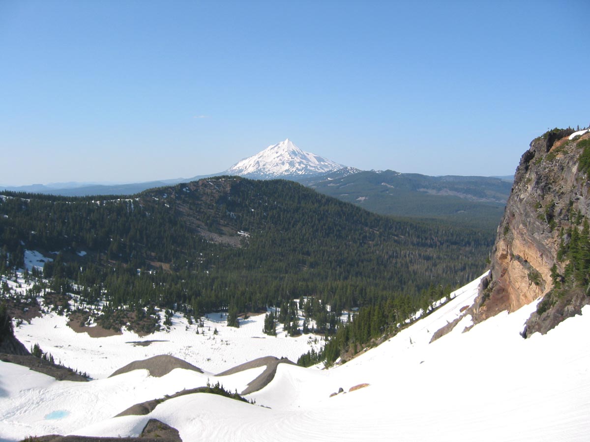 I left Seattle around 9 am Monday and managed to reach the trailhead at Jack Lake by 3 pm, with temps in the mid-80s. Seemed like perfect weather for an evening ski run on north or northeast slopes. The good 2-mile trail to Canyon Creek Meadows was 99% snowfree, yet as soon as I dropped over the ridge into the meadows at 5500 ft the snow became nearly continuous. I headed southwest following remnants of boot tracks up the main drainage leading to the toe of the Jack Glacier at 6000 ft. This small glacier is not shown on USGS topo maps, but it does have some active glacial features such as bergschrunds, and its presence makes TFJ the lowest glaciated peak in Oregon (and the lowest in the US outside WA or AK). I skirted the east edge of the glacier and moraines, then headed left (SE) to the highest nearby snow at the summit of Point 6855 on the East Ridge of TFJ. This ridge has a spectacular vista of Mt Washington and Three Sisters / Broken Top to the south, while the cone of Mt Jefferson dominates the view to the north. The cirque itself is very scenic too, with the dark rocky precipices of TFJ looming directly over the glacier and a small very blue meltwater lake.