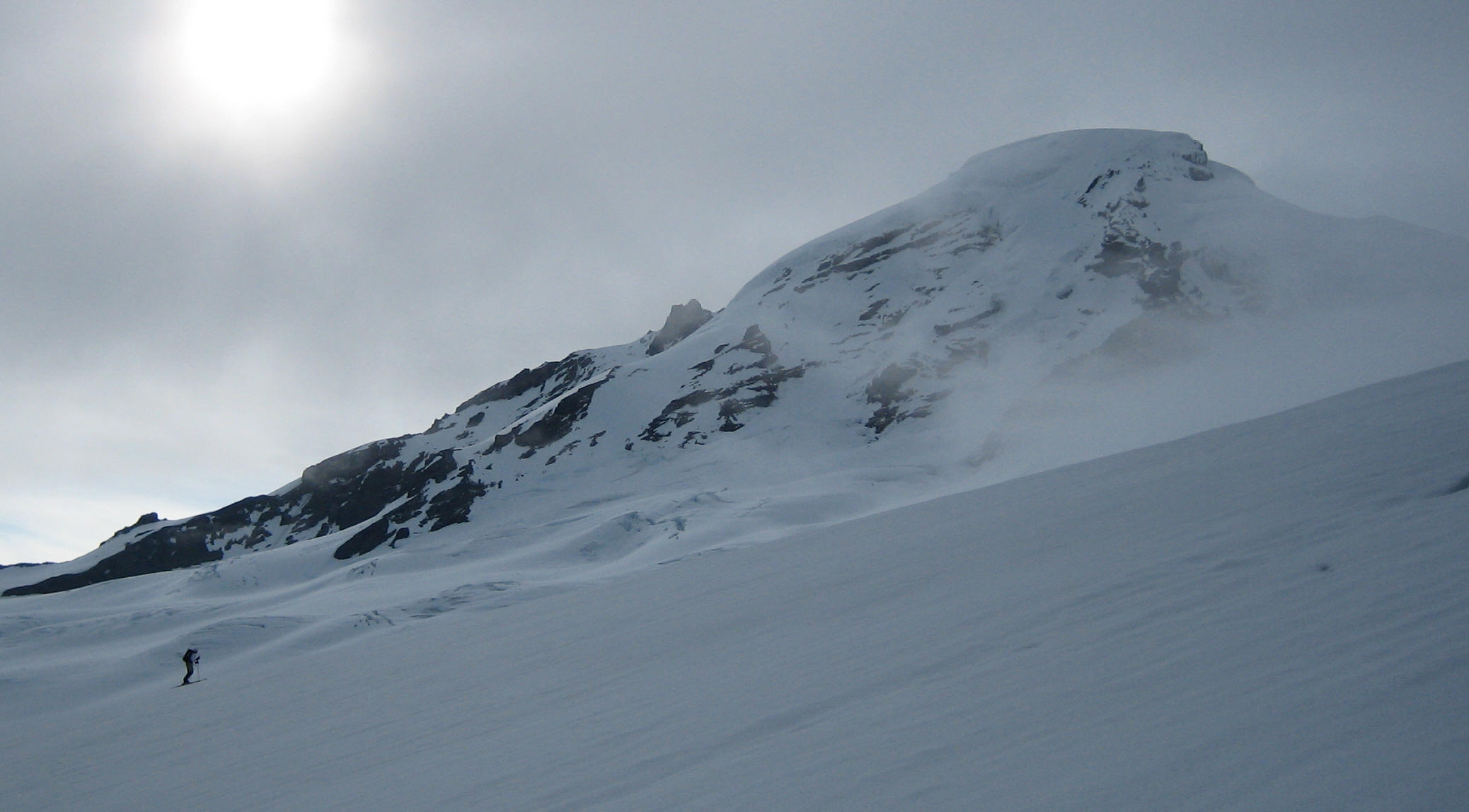 We traversed high towards the far north edge of the Park glacier and descended. Relatively straightforward crevasse navigation and the snow was pretty decent corn up high, maybe 6" of still quite skiable mashed potatoes lower down. Skied roped up for maybe 200vf at a roll-over midway down cause we couldn't tell if we were heading for a crevasse or not.