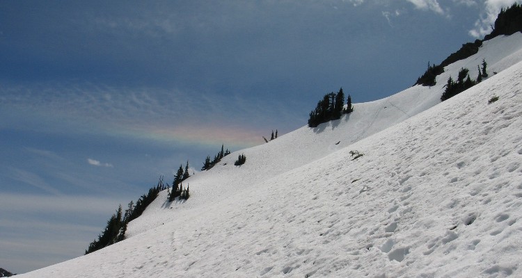 We parked at upper Tipsoo Lake and started our counter clockwise circumnavigation at 10am. Whats the rush? There was excellent coverage on the entire route. The snow surface is slightly sun cupped, and I saw the first signs of the red/pink algae in a few places. Ski penetration was 1-2. The snow pack seems consolidated and we had only a few small donuts on some steeper descents. Mt. Rainier had a lenticular cloud until around 12:30pm. We saw an interesting feature in the sky - a horizontal rainbow. The rainbow was a horizontal band and was only visible along a small segment of the sky. See photos. I also took a few photos of the Sunrise area which seems to have excellent coverage. There was a pleasant breeze during the entire trip. As we returned to the city, it became so warm that we actually turned on the vehicles air conditioning. Summer skiing just doesnt get much better.
