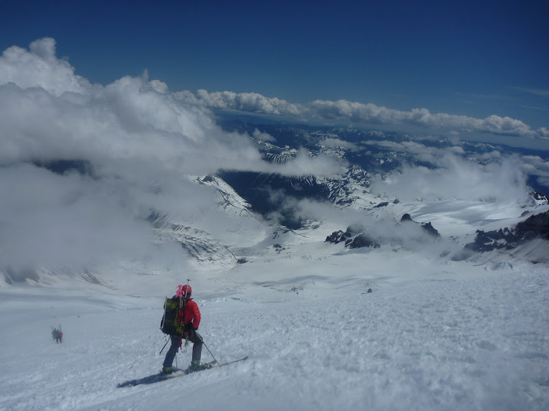 Reached the summit about 10am, put the skis on and headed down to retrieve a dropped pole. Found another pole and helmet along the way... Apparently everyone just leaves gear up there, REI must appreciate that.