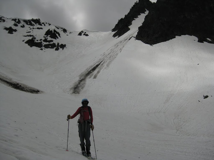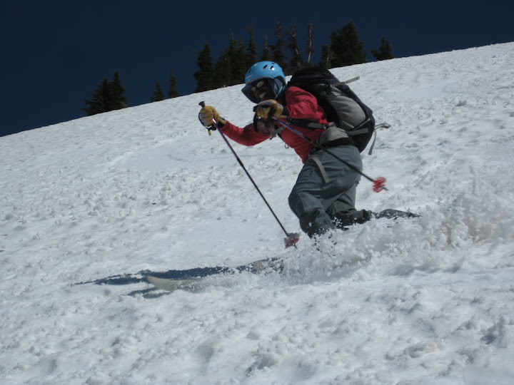 Brenda and I made a weekend of it with a camp at White River CG. Snow is finally in great shape and coverage is better than I can remember for this time of year. Saturday we headed straight to Pk 6567 for a quick run down the NW side, which was still a bit firm and bumpy. Climbed back up for a run down the SE side and some softer snow. Perfect. We messed around back there and did a little exploring to the next bowl below pk 6236 and got some water before heading back. Another run from the summit of 6567 and softer snow then back to the car. This was our first time camping at White River CG. I'm not a big fan of car camping, but this was really nice. The highlight was seeing a bear walk through the area just before dusk. Sunday we headed up to Sunrise for some fun at Sourdough Chutes. We did several runs in the bowl west of Antler Pk, including one down "fear factor", after booting as far as the headwall near the top. As I have a pretty good fear of heights, that thing always freaks me out. The first turn proved that it would be no problem however. Great coverag and great snow. Ski out over the meadows produced no hassles from the fuzz. What an awesome weekend.