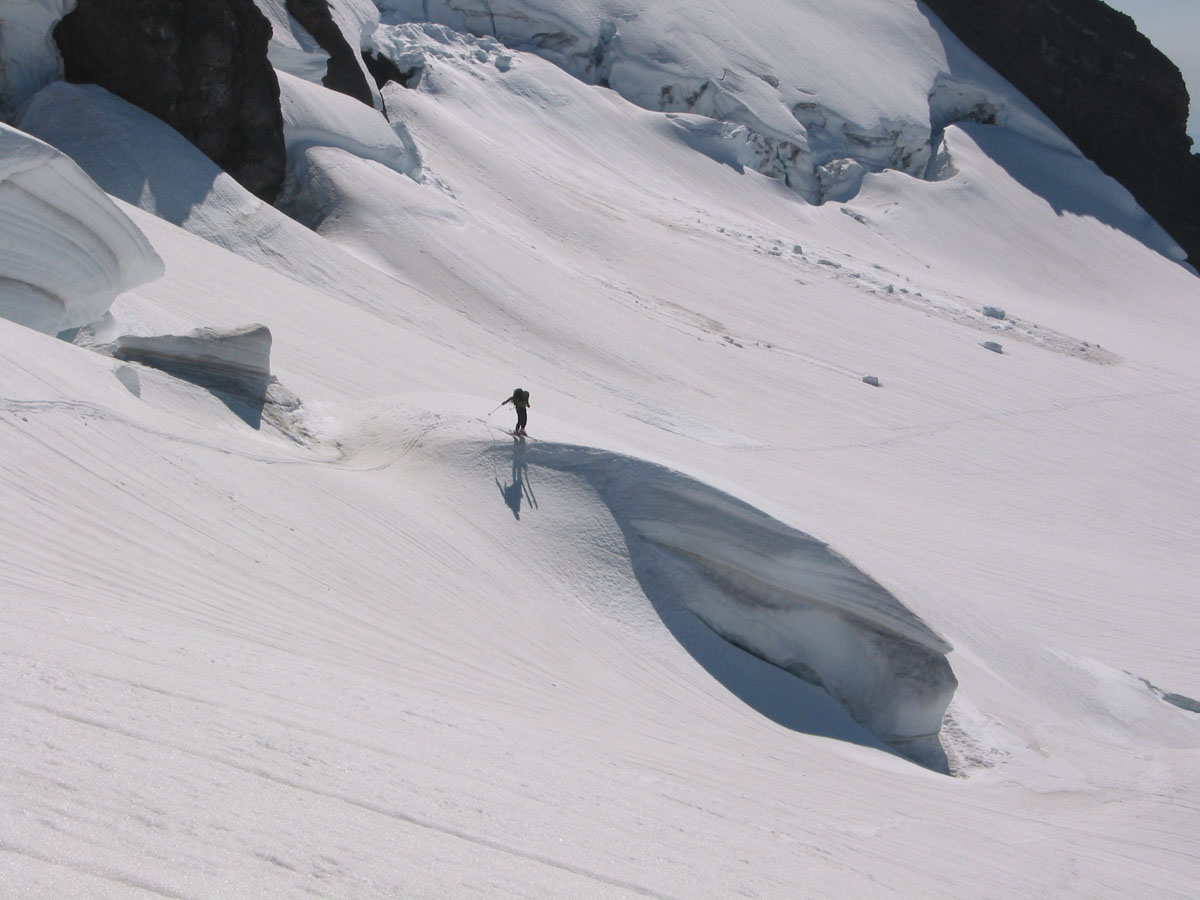 We skied off the summit at 3:30 pm, re-traversed the summit plateau, and headed back down the Roman Wall on funky snow, sort of granular with a thin crust on top. The crust disappeared below 10000 ft, and the snow turned to a mix of decent corn and heavier glop. The ski route was still continuous (just barely) across the rocky ridge above Coleman-Deming Saddle. The ski down the Coleman was fun, with big GS turns down smooth sections of the glacier punctuated with an occasional jump off the edge of an inviting serac. We saw numerous climbing parties, but we were the only skiers that day. Below the glacier, we skied down the gully to the right of the moraine and reached about 5000 ft, just above where the Glacier Overlook Trail crosses the gully. The hike out was livened up by a tricky creek crossing in the high water of late afternoon. All in all, a great day with beautiful weather and 5800 vft of nice skiing, despite the disappointment of having to forgo the Park Headwall.