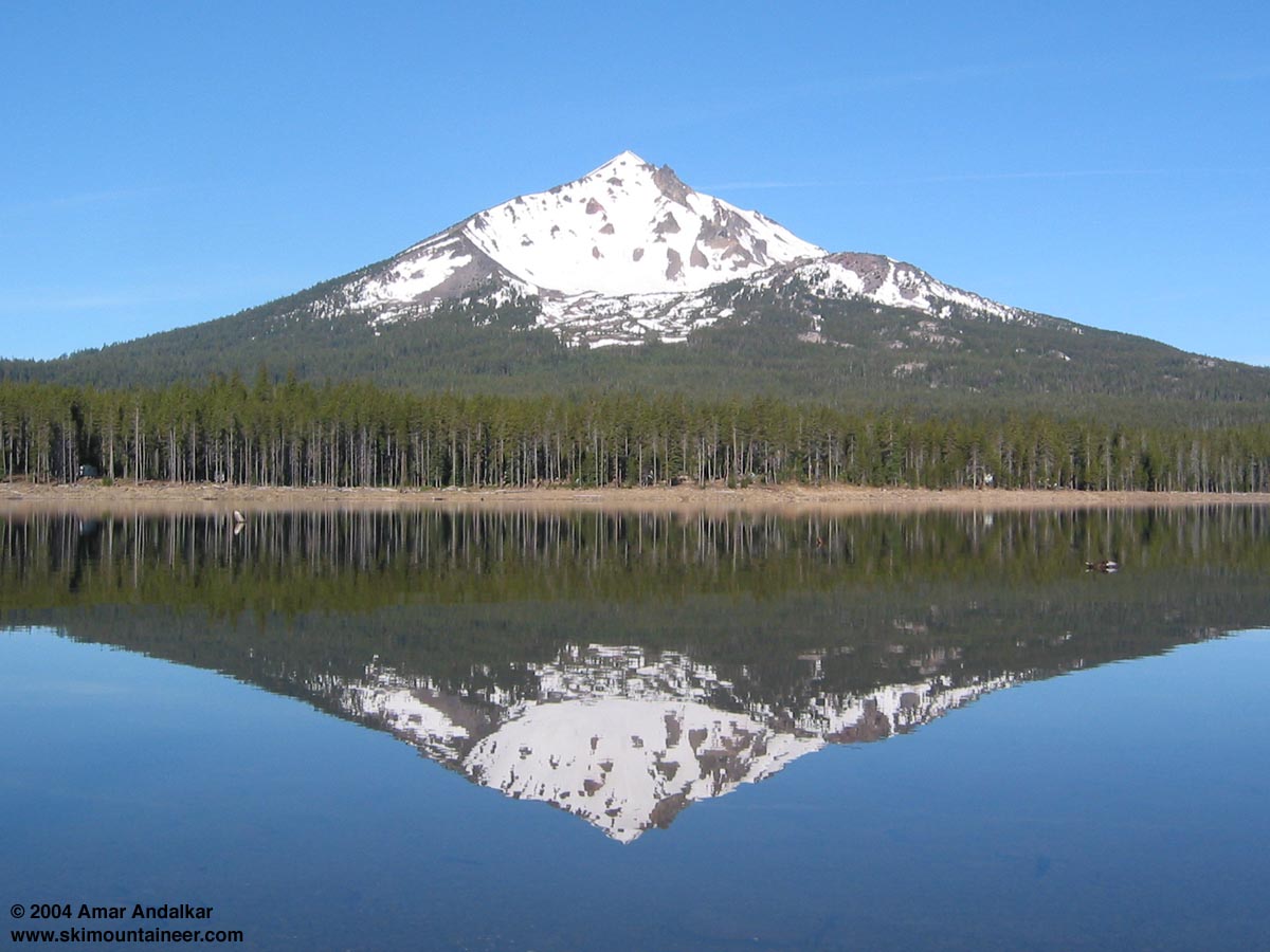 The awesome Northeast Face of Mount McLoughlin reflected in the mirrorlike surface of Fourmile Lake. Our ski route drops directly down the face from the summit. click here for an enlarged version of this photo.