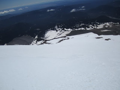 With a fresh partner for the day, we attempted to ski the WyEast face. I skinned up to well above the top of Superbowl with reasonably promising conditions. This is looking back down at my partner (who switched to climbing much earlier).