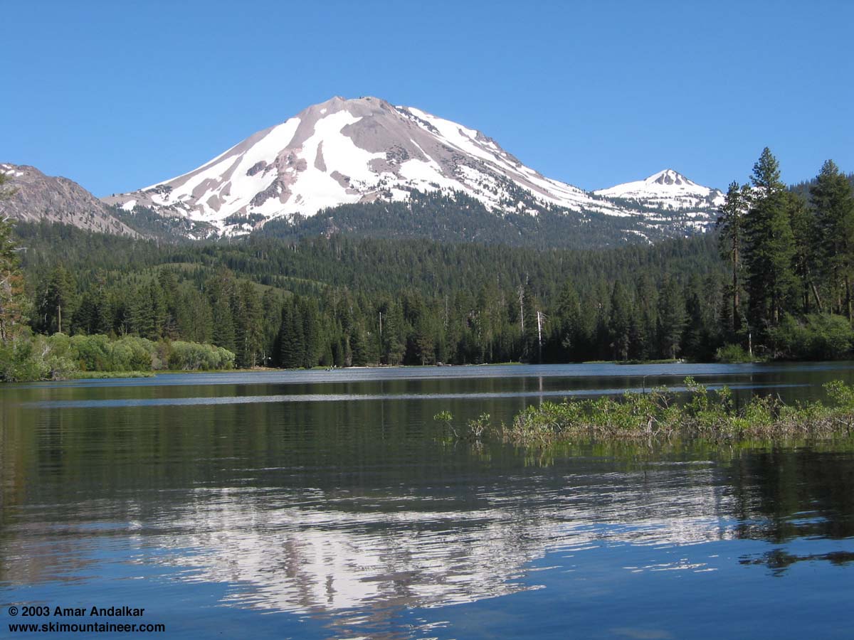This photo shows the classic view of Lassen Peak from Manzanita Lake. The west side route is seen very obliquely just below the right skyline, with the gully dropping in behind the black lava flow. Eagle Peak (9222 ft) is the prominent knob at right, and the summit lot is behind the saddle separating it from Lassen.