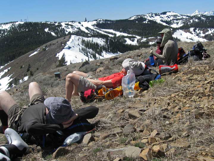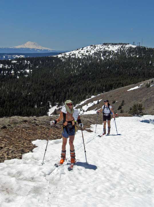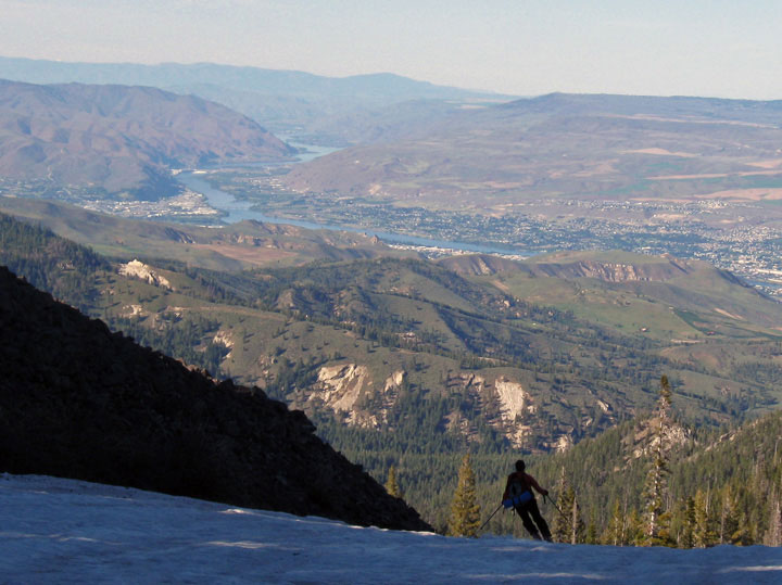 I had too much to do this weekend to accept the great offer of lodging and fun company for the weekend up in Mazama, but HAD to get out at least one day. We decided to drive out into the desert where there wasn't a scrap of snow to be seen and see what we could ski. Turned out pretty well, despite some skepticism as we drove through Wenatchee. We got on snow right at the ski area base, and were able to skin with just a few skinnable dirt/grass/gravel stretches by going up chak chak (sp?) to castle to skookum to the microwave tower where we hung out for quite a while summit lizardng among the massive amount of ladybugs. They bite, by the way!