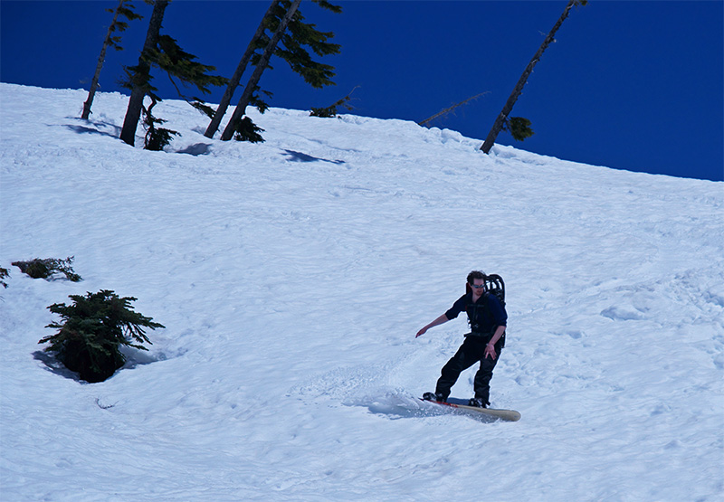 We descended the slow, heavy slop to Source Lake, then poled and rode out to the Alpental Upper Parking lot, hitting there at noon. A disappointing showing, but thats the price you pay for late starts in June. Nonetheless it was a gorgeous day, we made some turns, and exercised our bodies and judgment.