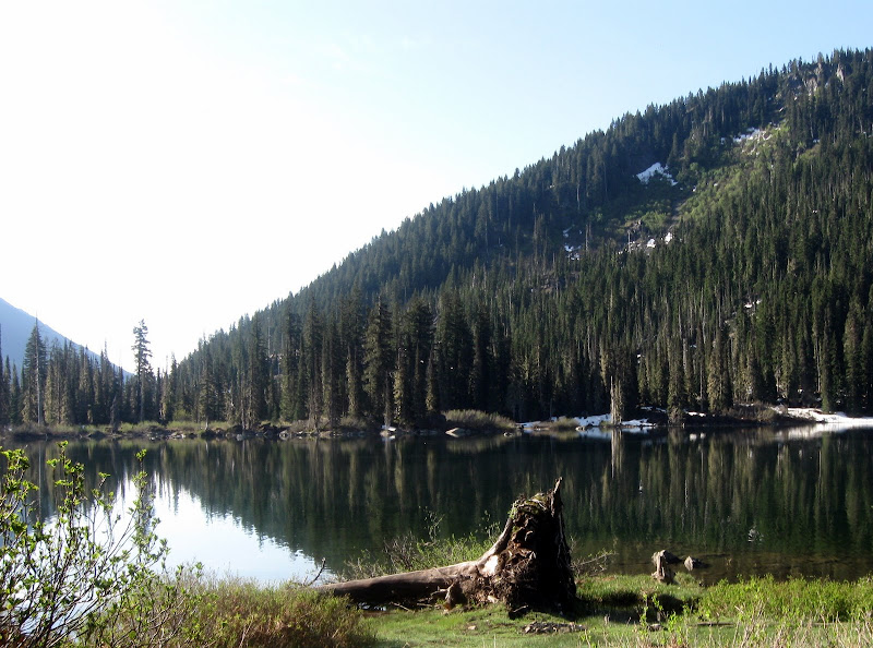 We set off at 6AM in sneakers from the Cooper Lake TH. We hit patches of snow almost immediately, but nothing long enough to bother putting on the skis and boots. In any case, the trail to Pete Lake is cursed with gaining only 300 feet in 5 miles, so even with continuous snow, snow is a dubious advantage, unless you've got pattern bases or kick wax.