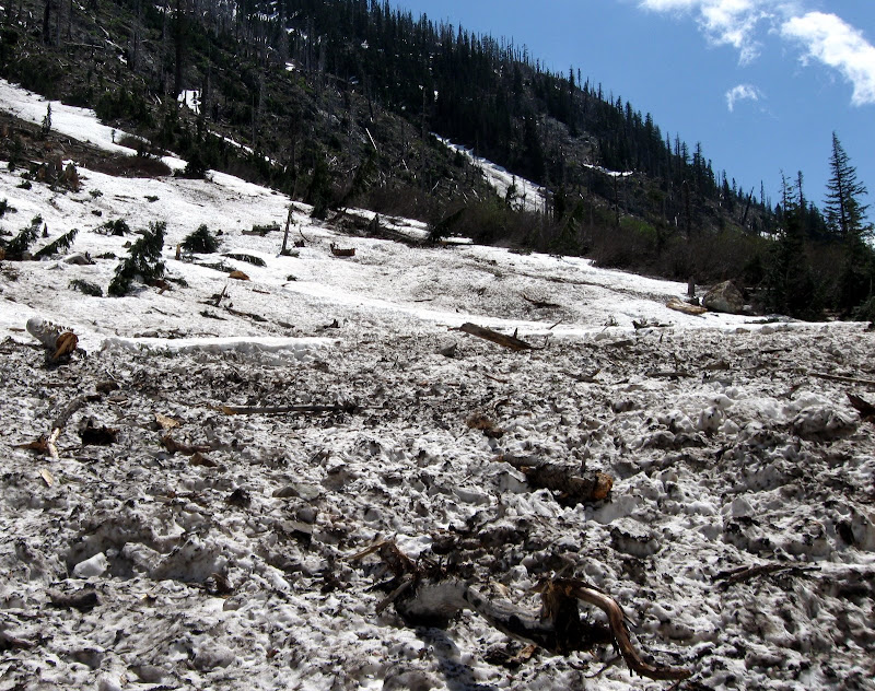 [One of numerous creek crossings, Pete Lake, One of numerous avalanche debris fans]