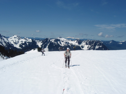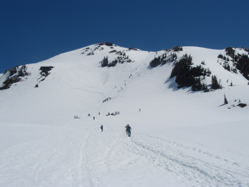Beautiful, bluebird day on the mountain, although increasing wind at Camp Muir. The boarding on the snow field was just gorgeous and our only regret was not skinning back up to do it again! The snow below about 8,000 ft warmed quickly in the early afternoon and got pretty sticky -- felt like the skins were still on! The mountain was pretty crowded (below) and lots of info bits were being exchanged about the Ingram avalanche this morning -- quite sad to see the helicopters flying in and out, still looking for the missing person. Each time one left, I hoped the person had been found, but then it would circle back for another look...