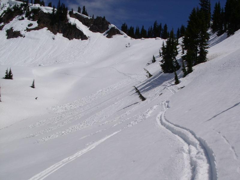 As I proceeded into the bowl, to my surprise, the higher I got the more I sunk in. I got below the lst chute to the top, and decided to abort. I didn't like the way things were shaping up. Lots of wet slides. Sinking deeper. I stopped and put the skins away and skiied down.