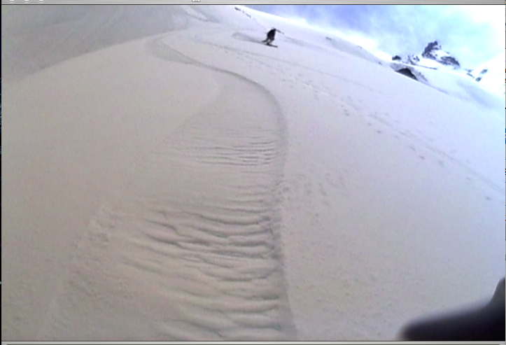 The ride down was pretty freakin' awesome with 4,000 ft of really good turns all the way back to the creek. The glacier is so wide that it felt like we were riding down a huge bowling ball; the turns were nice and carefree and the kind you can only get on a big glacier in spring. The angle increases as you roll over Meany Crest, and the spicier terrain rode great, with small, loose surface sluffs on the steepest terrain. The final huge bowl that had us a little worried about avy danger on the climb up was ripper on the way down.