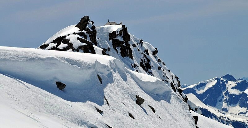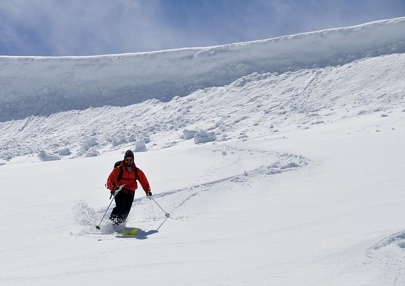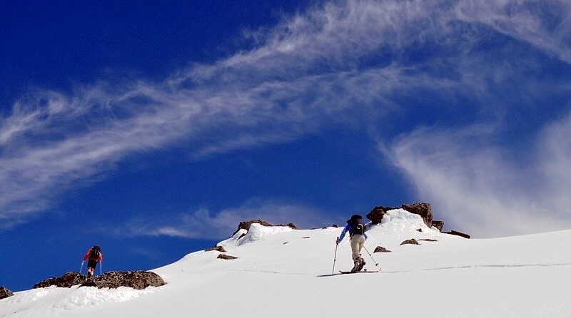 We got the high point of 7000' in 3 hours at our usual leisure pace. After enjoying a gorgeous view all around us, we headed down the East slope. The snow was wet, but easy skiing, except very sloughy. Anything over 30deg, it quickly gathered speed and chased us down. We skied carefully for about 500', then decided to go back up. The snow coverage is great and should provide fun skiing once it consolidates.