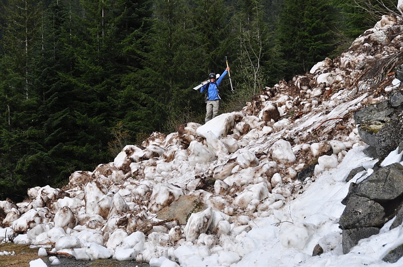 We chose to ski out the trail route, and skiing was quite good all the way down to the road. There is still a huge pile of avy debris blocking the last half mile (see the last photo). A nice loop trip, I will definitely try the ridge in Winter.