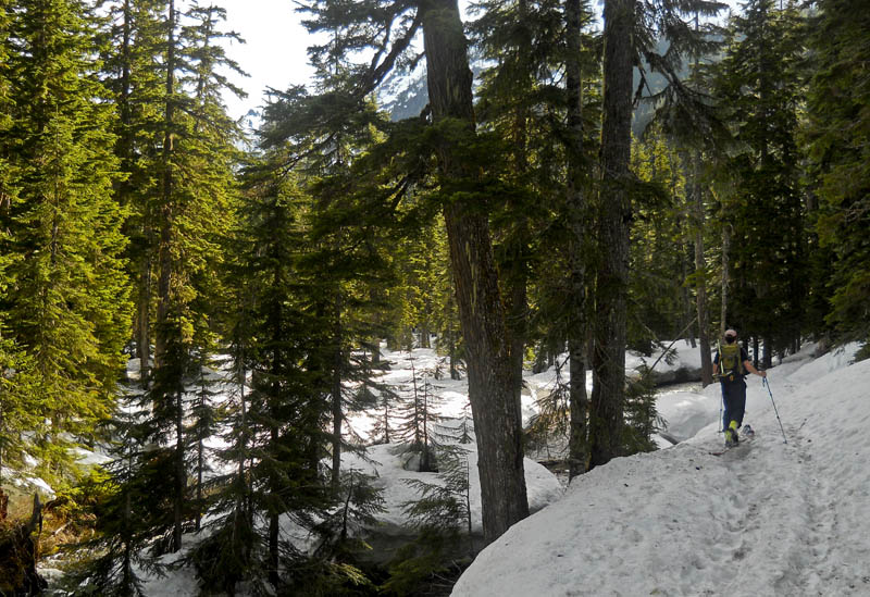 Headed up Commonwealth Basin and it's pine needle covered, snowshoe track trodden trail.