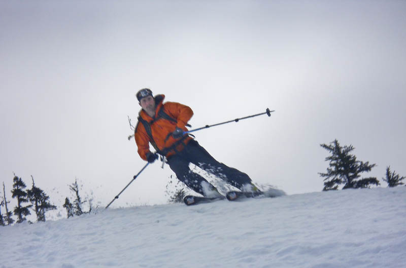 Came out of trees and the last few pitches of steep snow. I stayed back for the final 400' or so (no ice axe or whippet) and Randy headed a few hundred feet above me. I waited for Randy until he skied back down to me. I finally locked in and had some fun turns. We went skiers right and hit a few steeper sections, crossed an avy path and then shralped another steep open slope, jibbed a few tree rails and then plowed past the timber.