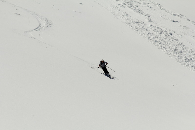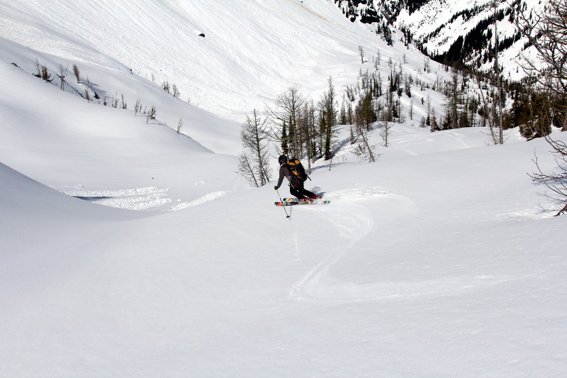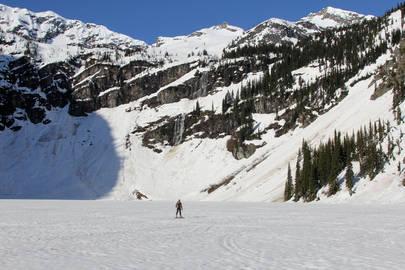 Richard and I skied the West side of Frisco down into Maple Creek. Left Rainy Pass around 7am, and had to boot part of the ascent to attain the bench above Rainy Lake. Starting skiing shortly after 10am, and the snow was firmer than expected, but completely edgeable and corning up nicely on certain aspects. At the very bottom it was started to get soupy. The ski down to Ann Lake had a foot of slush, and we triggered a number of small, wet, loose slides. With some slough management and terrain selection, we carefully made our way down to the Lake and then back to the car.