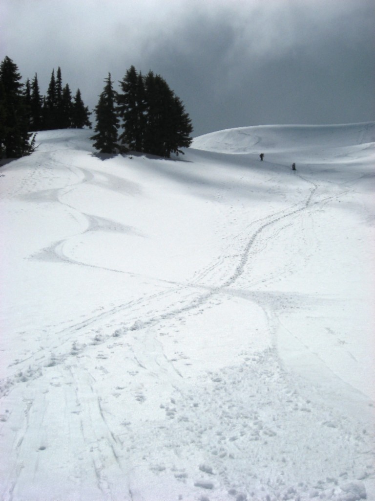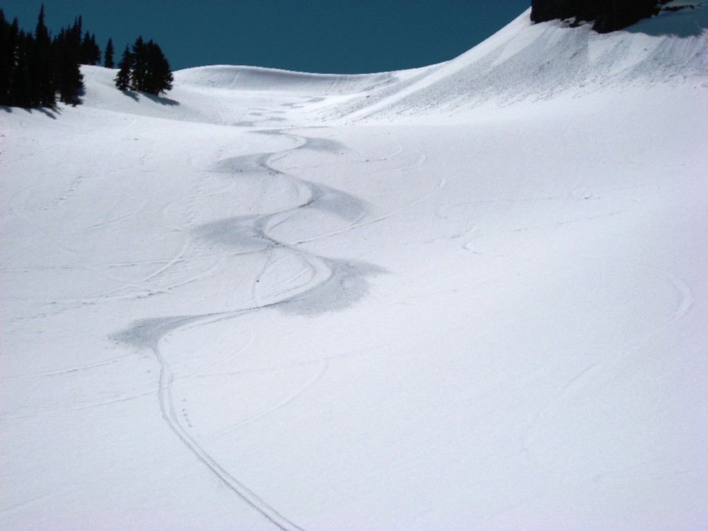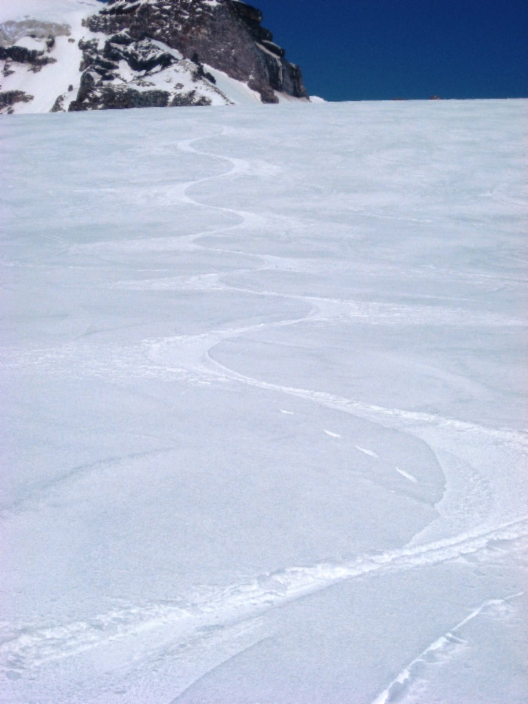 I planned to do laps for as long as the snow held up. A lap was a mere 500 vertical feet but I had the place mostly to myself. I got three runs from the Castle saddle and then one more from the Pinnacle saddle. My last run caused a slow motion wet snow slide that took about a minute to run about 50 feet. Castle/Pinnacle was a good warm-up for the long climb to Camp Muir the next day.