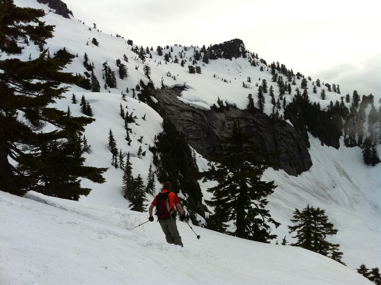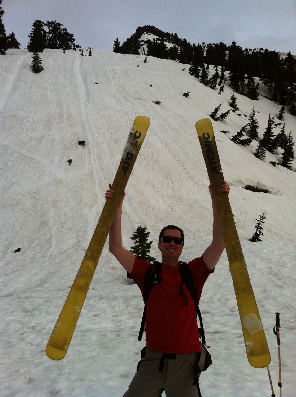 Joined some Snohomish County locals this afternoon for an ascent and descent of Mt Pilchuck. We drove within 1/2 mile of the parking lot and were able to keep skis on all the way up and down. 2-4" slush did not sluff very much even on steep (40 degree) slopes. Grabby pollen all the way down.