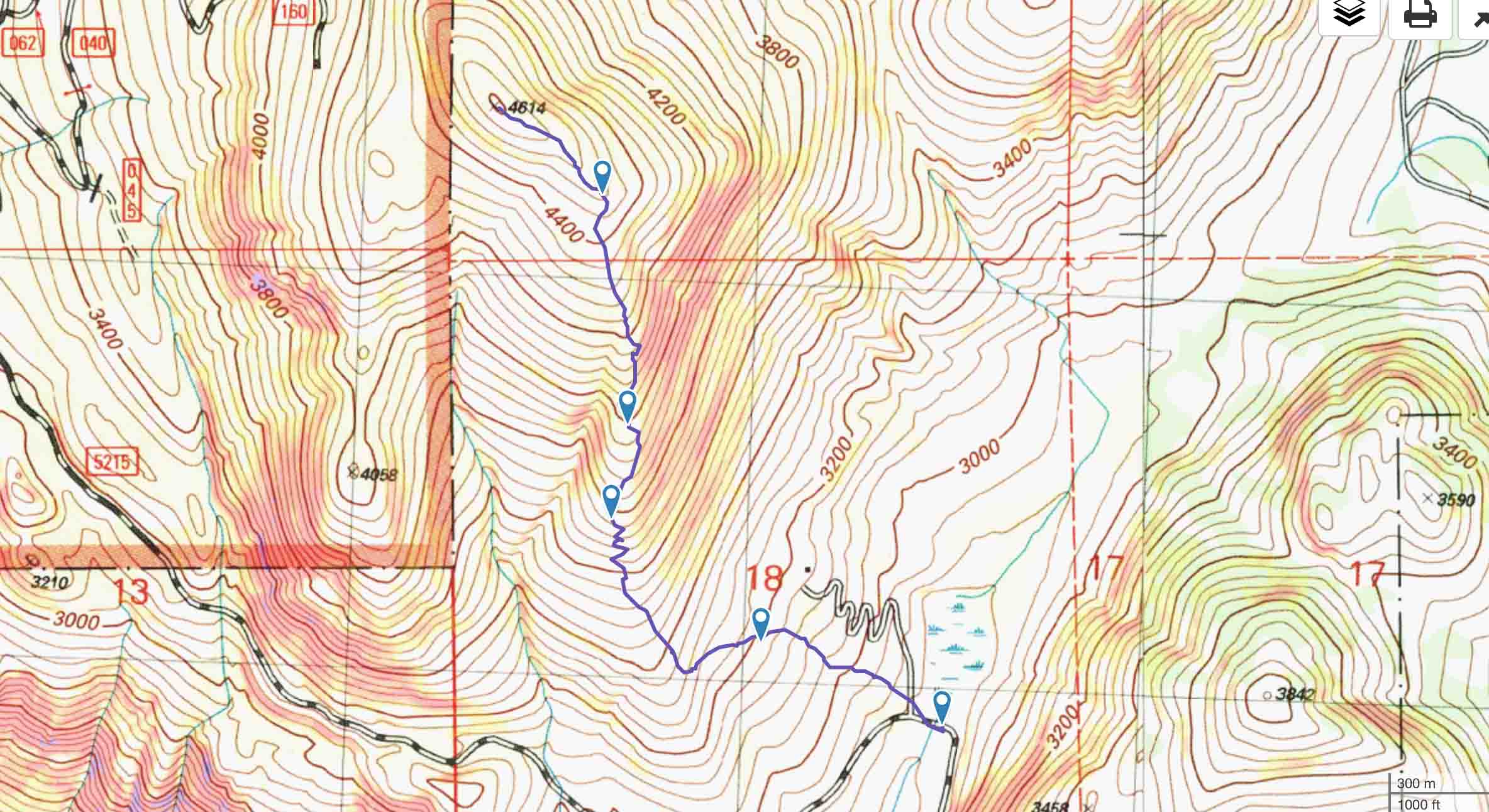 The next day was a half day ski. I had heard that when conditions were right the skiing out of the Gunn Ranch TH on the south east slopes of Peak 4614 could be pleasant with no sleds needed... just skin up from the XC ski TH. So we gave it a try. The day was gorgeous and a nice skin track took us gently up 1700 verts to the knob. (see GAIA track). We rested in the sun and enjoyed the tremendous views of the Methow Valley. The top half of the descent was very enjoyable doing sweeping turns in 6-8" of powdery corn. The next half was skiable but not as fun with 2-4" on a hard chattery crust. But staying high we were able to ski right back to the car. A great way to spend half a day. I look forward to coming back next year the day after a typical 12-18" snowfall. I think this close-in skiing would be super convenient and fun. And I could also get in some XC nordic. Cheers!