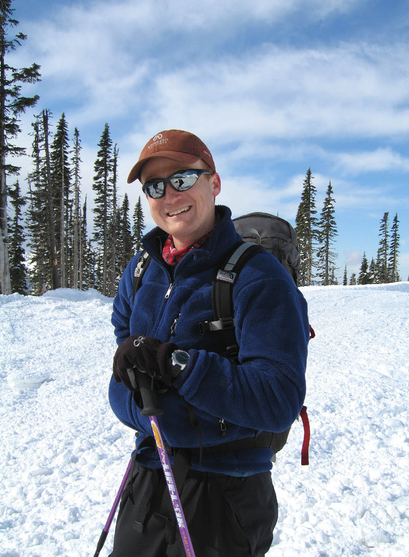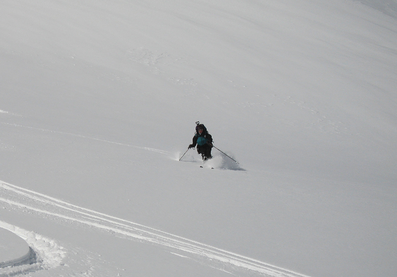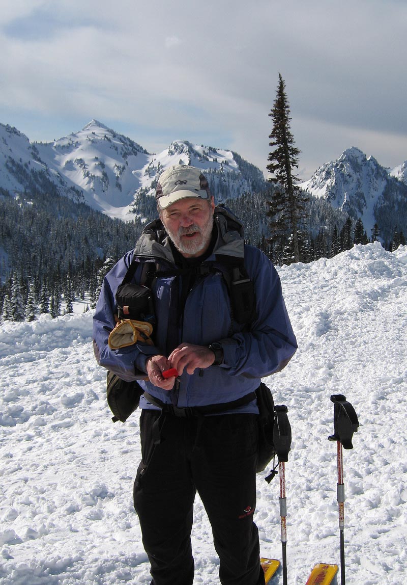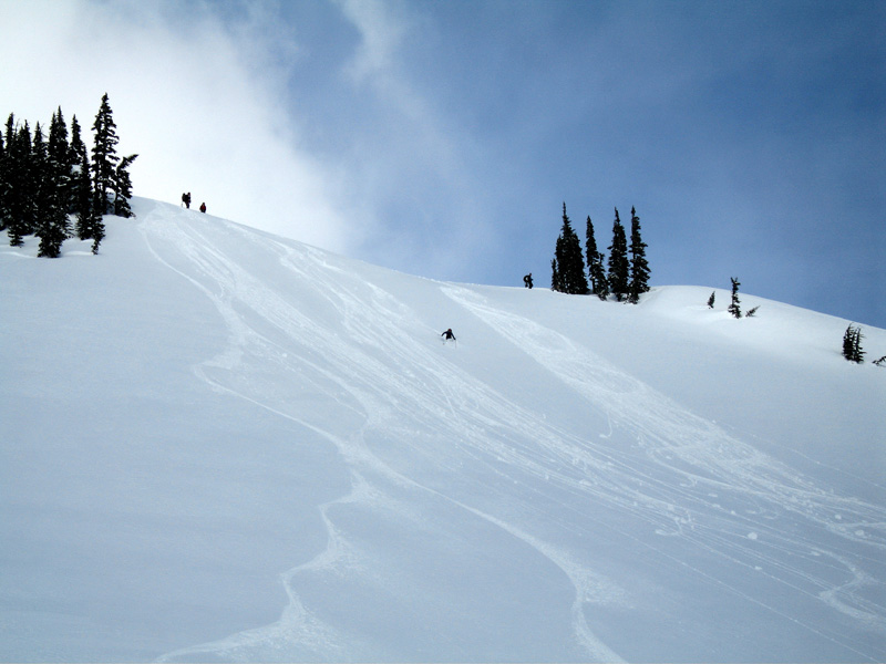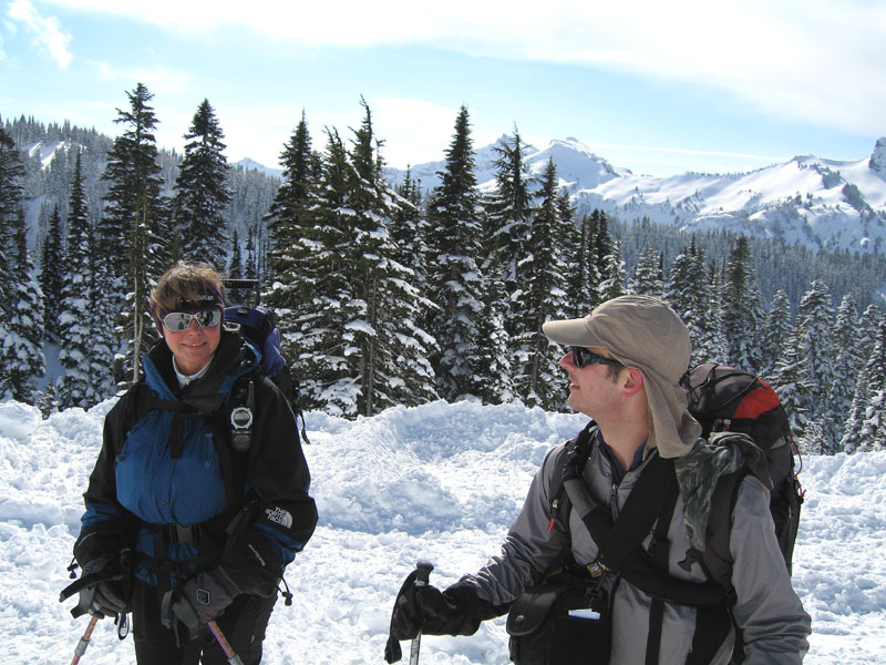 Thanks Stefan for getting another year older and planning your very own birthday ski in the Mazama Bowl ;D. Several of us met at the Tall Timbers in Eatonville before heading to Paradise for some fun. The gate at Longmire opened before 9:00 a.m. with clear skies, sun, no wind and lots and lots of new snow ;D. 16 of us gathered in the parking lot, prepared our gear and headed down the lower Paradise road to the bowl. We skinned across acres and acres of fluffy new snow, arriving at the sun filled bowl only finding a couple of tracks. South facing aspects started out with good skiing, but crusted up quickly as the sun was partialy covered and the temps dropped. We were scattered in all directions of the bowl getting our fill of fresh, light, and some crust conditions. North facing aspects seemed to survive skiability throughout the day better than south facing. Several layers, beginning about 4 inches down and 6 inches apart with varying degrees of bonding between the layers, down to about 18 inches with no easy shears noted. No releases noted except natural point releases on very steep slopes. We set up party central at the base of the bowl, and met there occasionally, for some great food, wine, and peanut butter pie. You can see some of our fun here ;D.