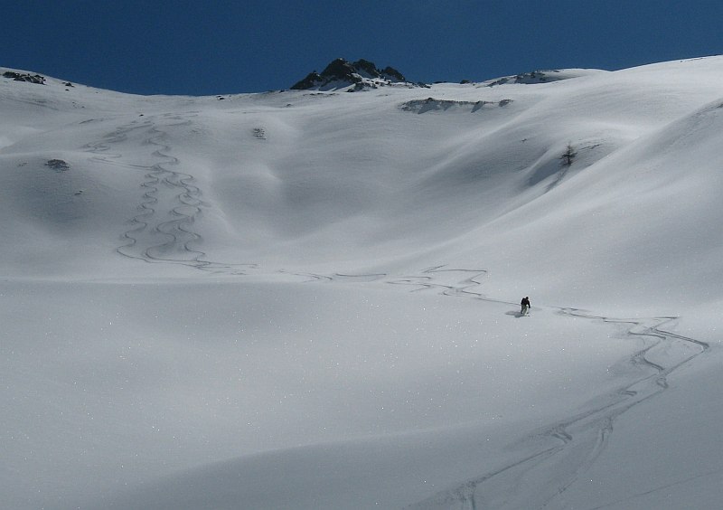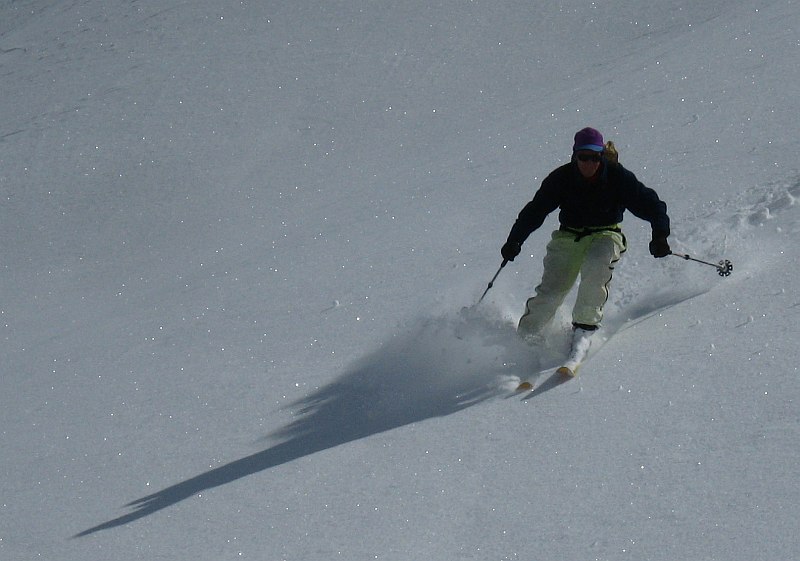 An hour up the trail it was obvious that no corn would be found, so the objective changed to a peak with northwest facing slopes, dust on crust (unbreakable thankfully) to a few inches of windpressed powder higher up. Great views to the Stubai peaks and Silvretta ski areas, then nice powder for about 800m following a local who had raced up the hill to catch us. Only a hundred meters or so of "carton" crust, then an easy 250m ski out on a forest road in wet heavy powder remains. Home for late lunch, no stops for dessert. :(
