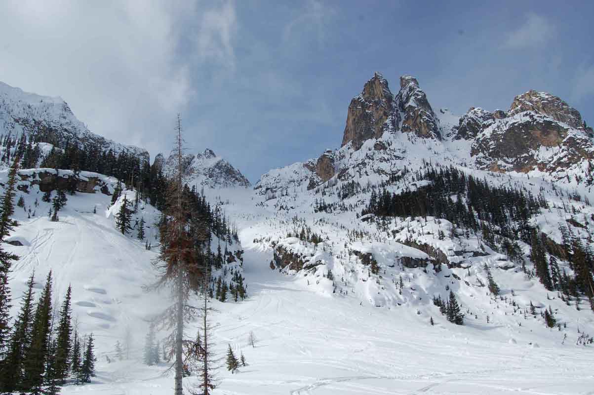 Not wanting to risk a week's worth of spring break ski potential on a funky forecast, Alli and I headed over to Washington Pass. Turns out the approach makes a whole crap ton more sense on a snowmobile but we still got more than our fair share of long powder runs and impeccable weather. Runs skied included Half Moon on the south end of Kangaroo, and runs from the spires down towards the hair pin and blue lake.