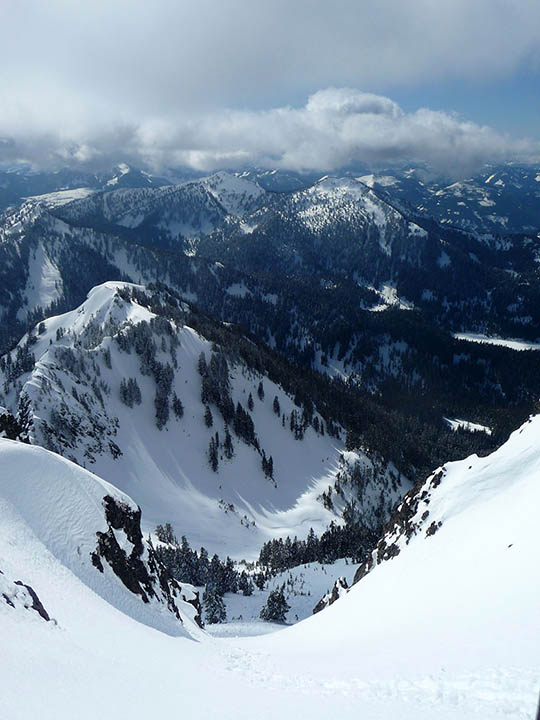 Rob and I left work a bit early on a beautiful Friday and skinned up to the shoulder of Chair Peak. Skiing down to snow lake was very good, with fair coverage over the big slide path and debris field. We went north across the lake and set up camp on one of the small outcroppings with a great view back to the north face of Chair and down the lake to the east. Saturday morning was spent relaxing in the bags, enjoying coffee and hot breakfast before we spotted Ross crossing the lake towards us. We hustled to pack up as he approached and the 3 of us started heading up towards Roosevelt. Booting up the ridge was a workout with overnight packs, the sun was out and well, it would have been a workout with a light daypack anyway. It was spectacular. We skied from the skiers summit and then down the north couloir which held pristine and excellent snow. A break to eat and melt snow at the bottom of the bowl and then it was up one of the steep gullies of the Lower Wildcat Lake drainage to the ridge. We skied trees down to Kaleetan Lake, crossed the lake and ascended the steep ridge separating Kaleetan Lake from My Lake. By the time we reached the top of the ridge it was time to camp. Ross and Rob constructed an excellent flat platform while I melted snow. Dinner tasted great. Sunday morning we traversed the ridge eventually contouring into the bowls south of Kaleetan. Ski crampons were perfect on the firm smooth surface and they stayed on most of the way up, finally booting the final bit from the choke point in the summit gully. The summit was totally snow covered and we pulled our skins from a small cut platform on the south face with our heads above the summit. Its possible that an hour earlier the snow might have been rock solid and an hour later dangerously mushy. Luckily for us it was near perfect softening protocorn. Lots of beautiful old growth touring, across the Pratt River, several lake crossings, plenty more old growth touring followed on this beautiful sunny day before we started up the north side of Granite Mountain. Unaware of the previous days tragedy we skied conservative lines to the south west. We fanned out as the slope steepened and each of us set of wet slides with one running all the way to the moderate slope below. We then skied the slide paths which were firm, but relatively safe. Definitely super fun weekend with great company a few spectacular summits and lots of beautiful touring.